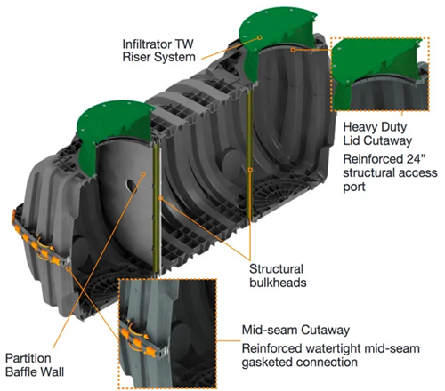 The Infiltrator IM-1060 is a lightweight strong and durable septic tank. This watertight tank design is offered with Infiltrator’s line of custom-fit risers and heavy-duty lids. Infiltrator injection molded tanks provide a revolutionary improvement in plastic septic tank design, offering long-term exceptional strength and watertightness.